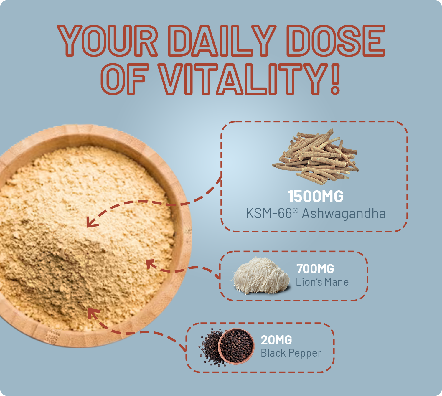 Enriched with black pepper, our Ashwagandha and Lion's Mane supplement was formulated to ensure your body receives the full benefits of each nutrient.
