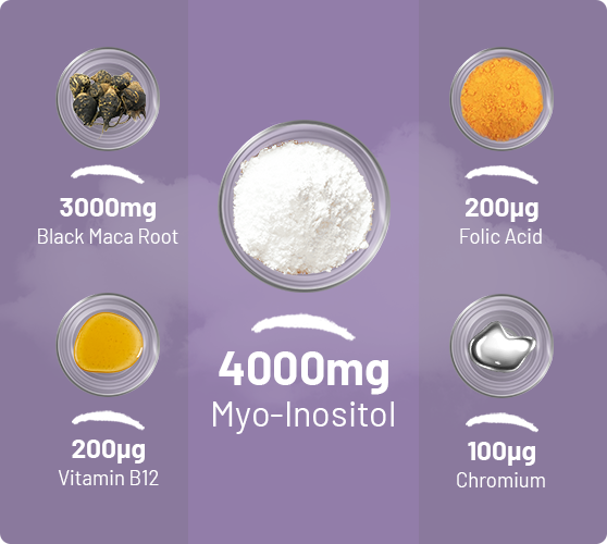 Specially formulated to regulate ovarian function and help your body combat polycystic ovarian syndrome, our Myo Inositol Complex supplements improve your insulin sensitivity and support your reproductive wellness. Each Myo Inositol Complex tablet is rich in Folic acid, vitamin B1 and chromium, which improve DNA synthesis, support foetal development and improve both nerve function and metabolic balance. With added chromium and Black Maca Root, your stress and hormone levels will be kept in check.