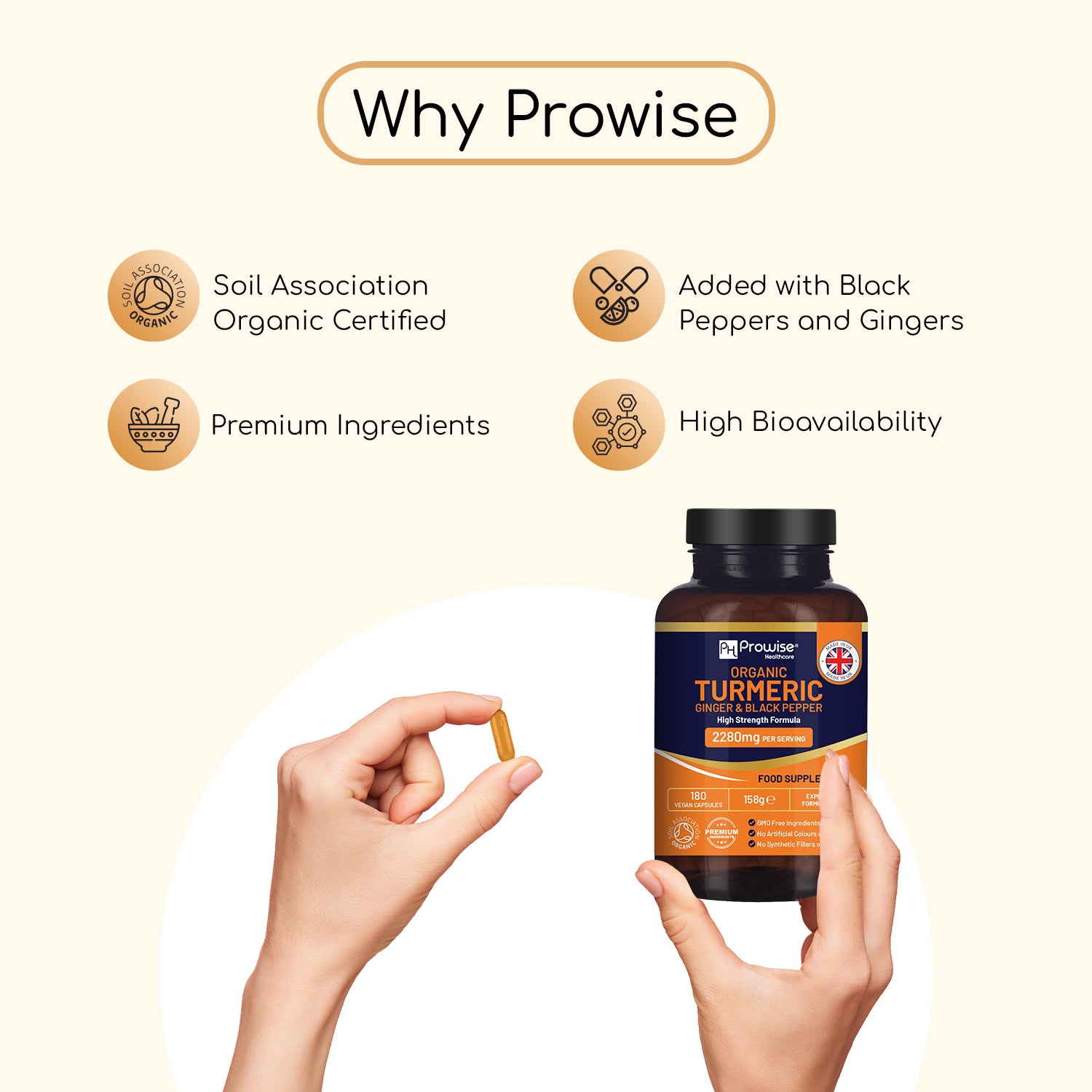 Prowise Organic Turmeric Curcumin capsules provide a comprehensive wellness solution for both your body and mind. Infused with organic black pepper and ginger , they ensure a remarkable 2000% increase in absorption, allowing you to fully harness the anti-inflammatory and antioxidant potential of turmeric. Experience the benefits of improved joint and muscle health, enhanced brain function, and the detoxification of your liver. These capsules also contribute to supporting kidney function due to their rich antioxidant content. Crafted from 100% Soil Association Certified Organic ingredients, you can have peace of mind knowing that each capsule is a potent source of organic goodness, free from any harmful additives or chemicals.