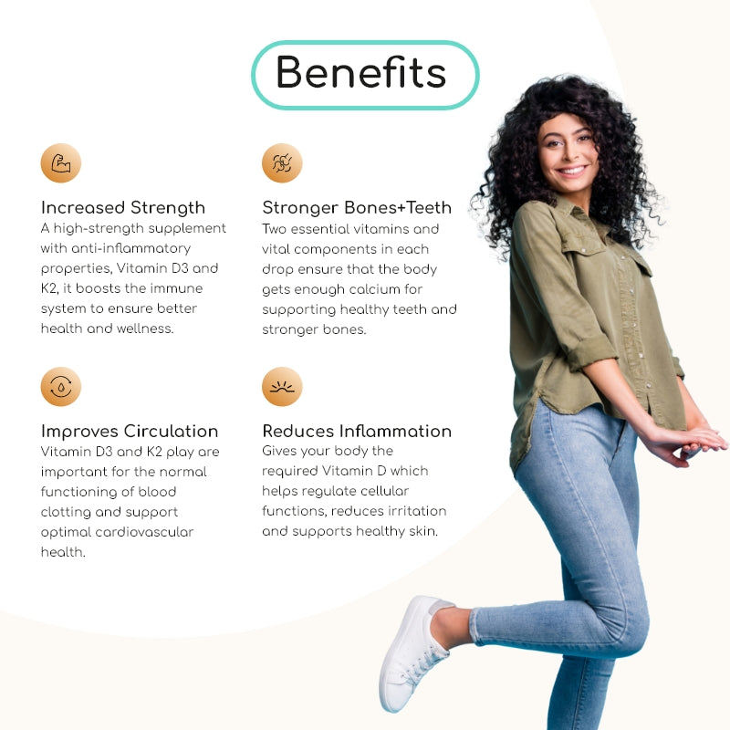 Two essential vitamins and vital components in each drop ensure that the body gets enough calcium for supporting healthy teeth and stronger bones.