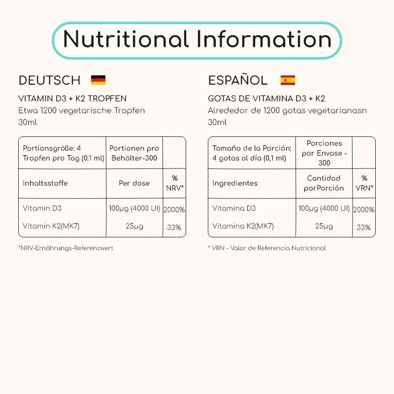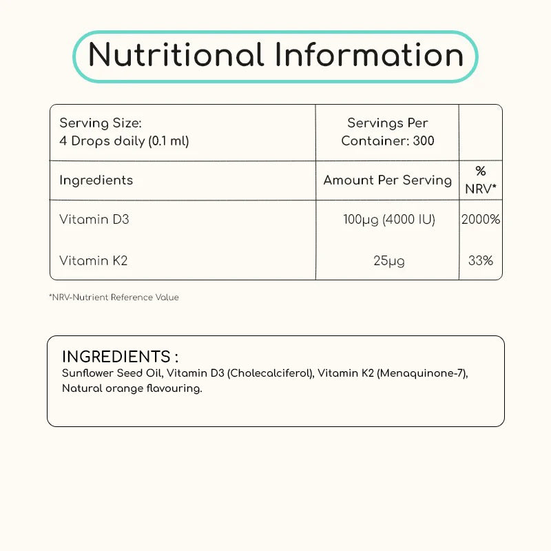 Carefully crafted by healthcare experts, Vitamin D3+K2 is required for healthy bones, teeth, muscles and for overall well-being. This is a 30ml bottle containing 300 servings (4 drops daily) with approximately 10-month sufficient supply to give you better results.