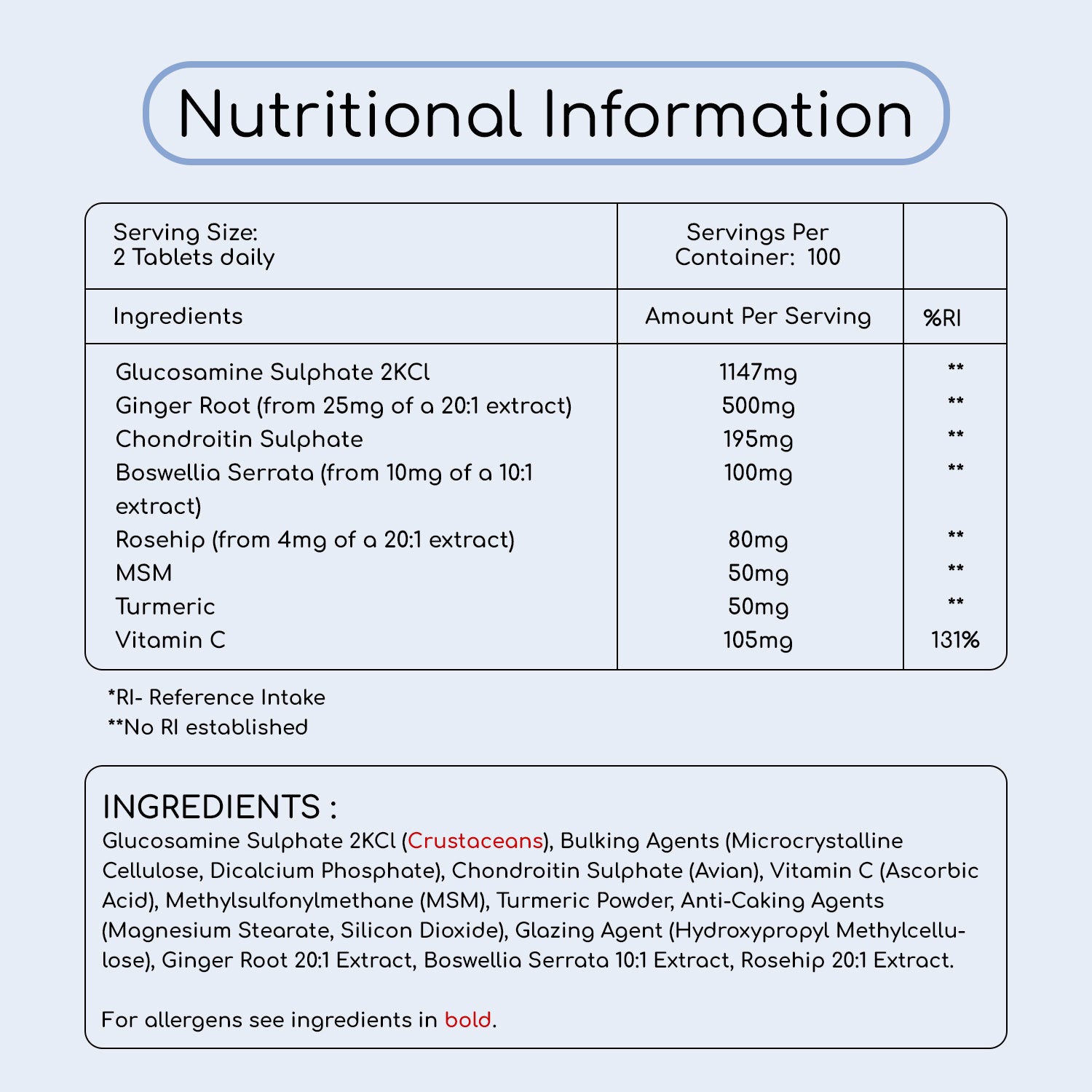 From glucosamine sulphate to ginger root and rosehip, our formula encompasses 8 essential components carefully chosen to combat inflammation, boost immunity, and help overcome fatigue.