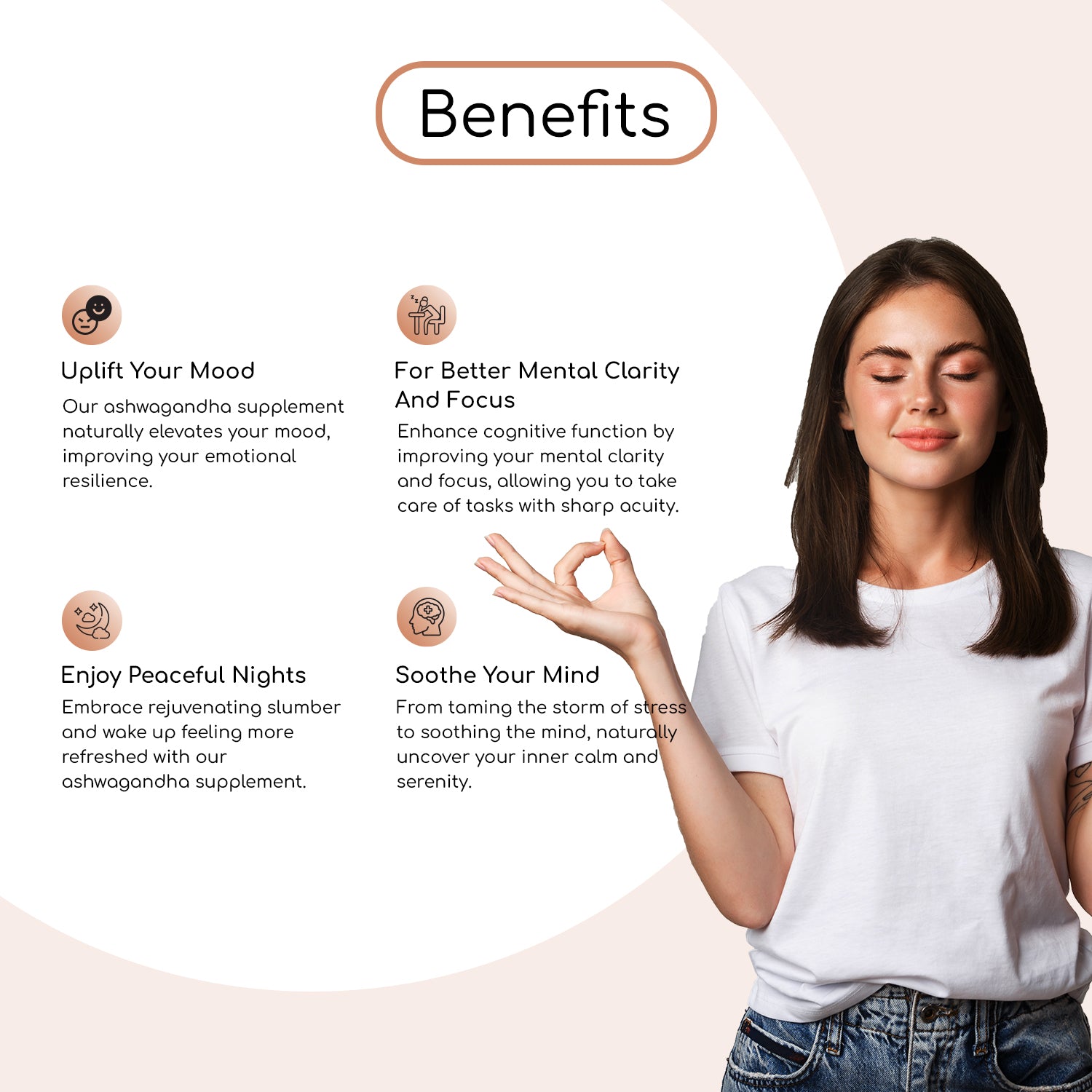 A powerhouse specially formulated to invigorate your mind and body, our ashwagandha tablets serve as a natural way to support mental health and reduce stress. Experience improved mood and better emotional balance while fortifying your body's defences.