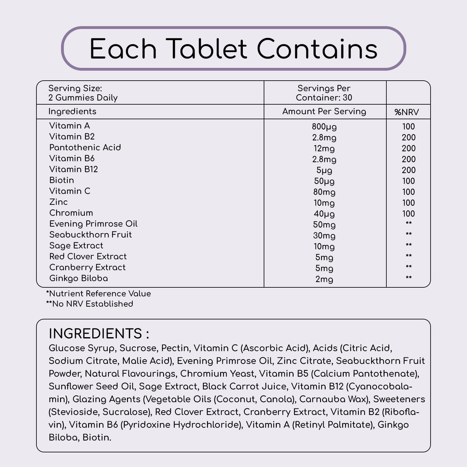 Made with a powerful blend of evening primrose oil, sea buckthorn fruit, sage extract, ginkgo biloba and red clover these delicious Tutti Frutti flavoured gummies support your hormonal balance.