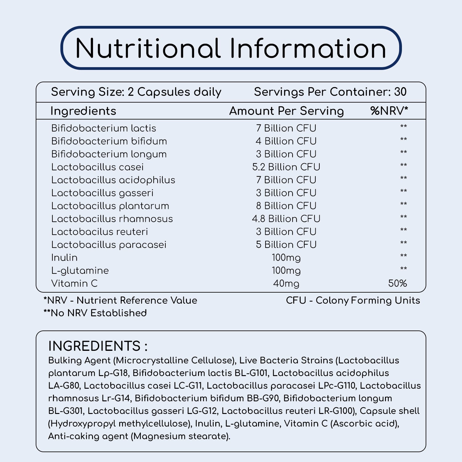 What’s more? Our probiotic supplement is enriched with inulin, vitamin C and L-glutamine which allow probiotic cultures to survive stomach acidity and reach the gut for maximum effectiveness. The result? A balanced microbiome, smoother digestion, better immune defence and enhanced energy levels.