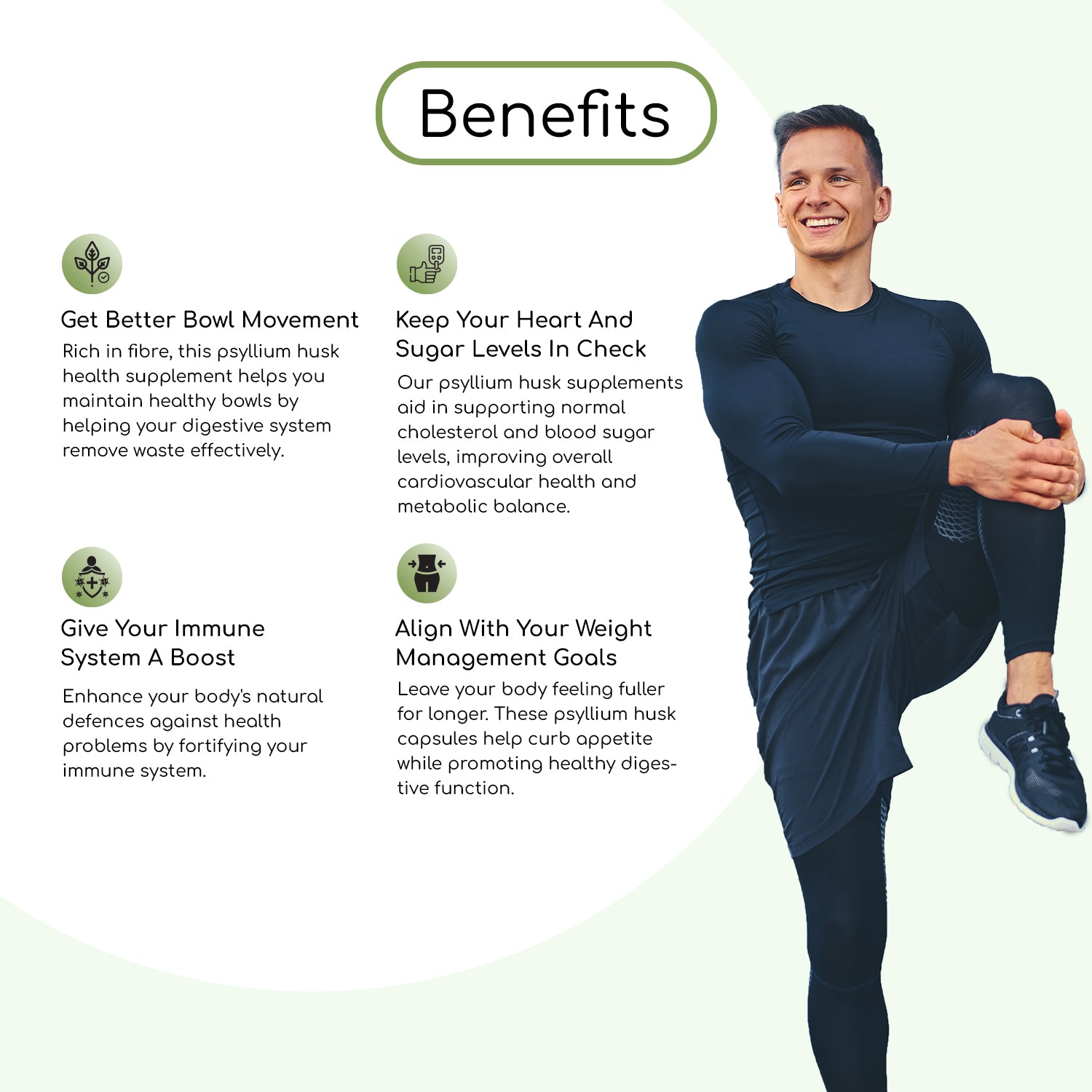 Rich in fibre, our psyllium husk dietary supplements effectively remove water, waste and toxins within your bowls, improving your gut health. It also keeps your blood sugar levels and cholesterol levels in check, boosting your immune system. Can't seem to keep the cravings at bay? Our psyllium husk capsules help promote the feeling of fullness, making it easier for you to manage your weight.