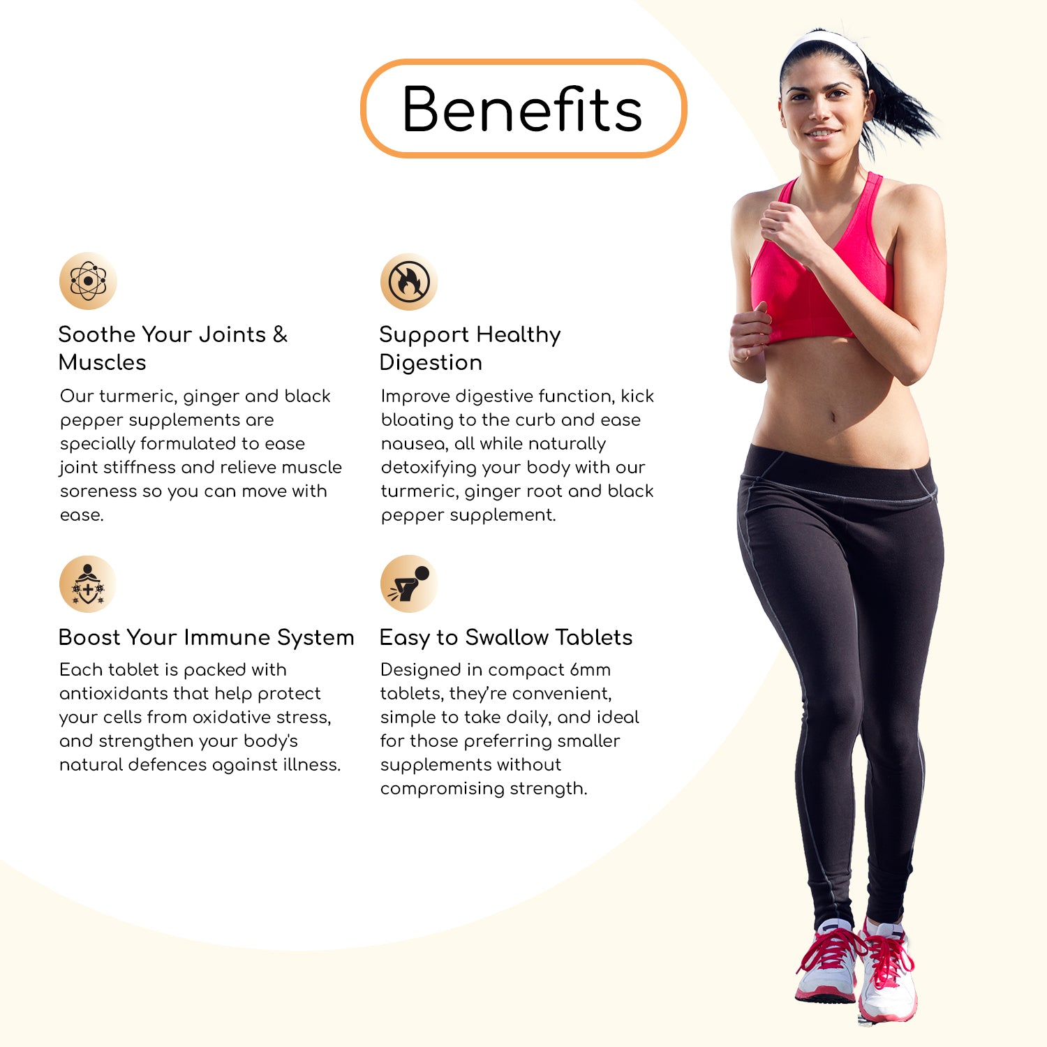 Our turmeric, ginger and black pepper supplements are specially formulated to ease joint stiffness and relieve muscle soreness so you can move with ease.