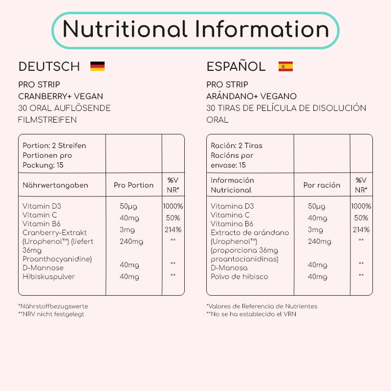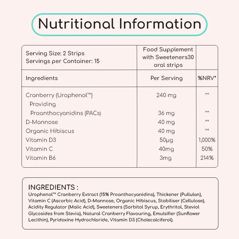 Enriched with 36 mg of soluble Proanthocyanidins (PACs) derived from real cranberries, this product promotes urinary tract health and strengthens your body's natural defences with every dose.