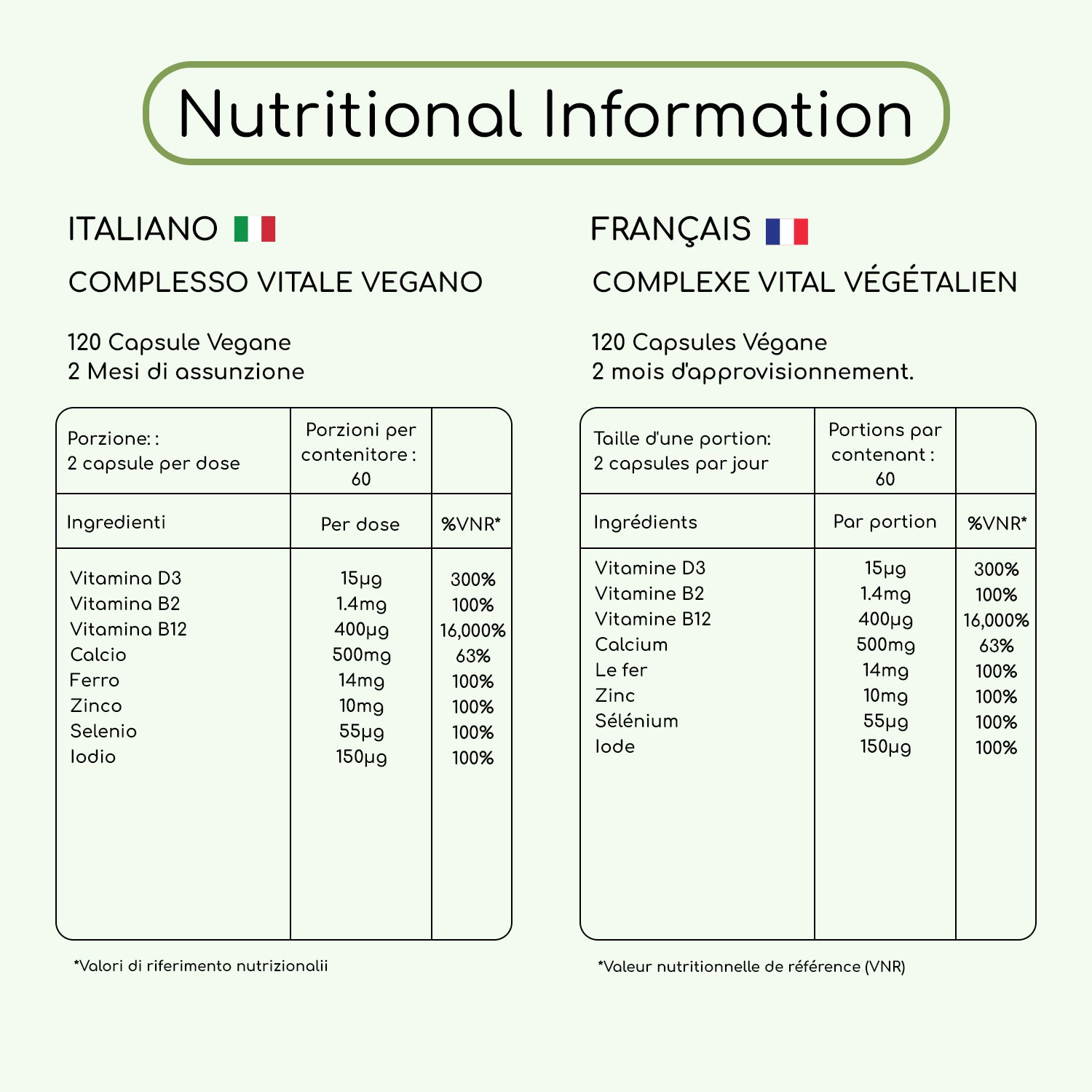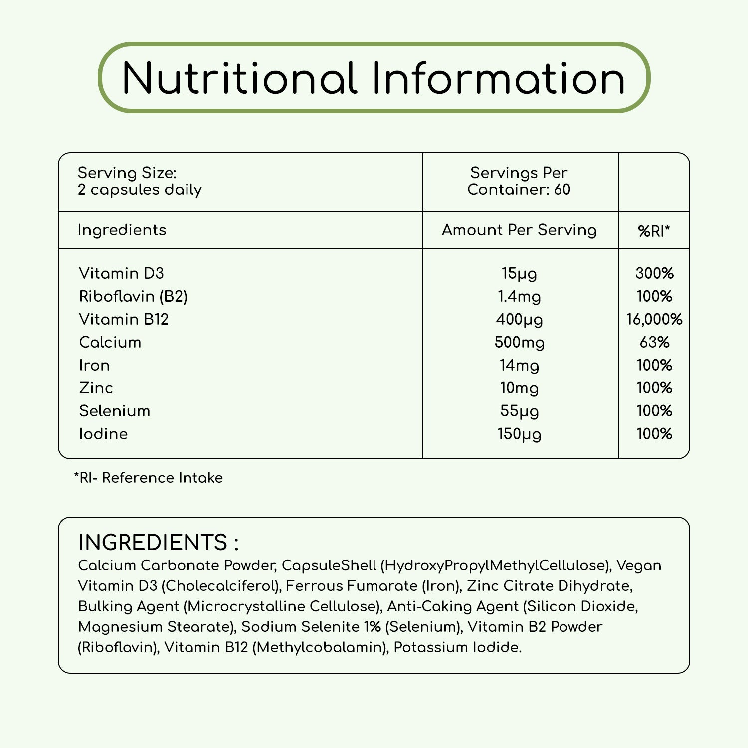 Enhance your energy, immune system, and overall vitality while contributing to the normal function of red blood cells, bone maintenance, and reduction of fatigue. Packed with essential vitamins and minerals including Vitamin D3, Vitamin B2, Vitamin B12, Calcium, Phosphorous, Iron, Zinc, Selenium, and Iodine, each capsule is a step towards optimal health.