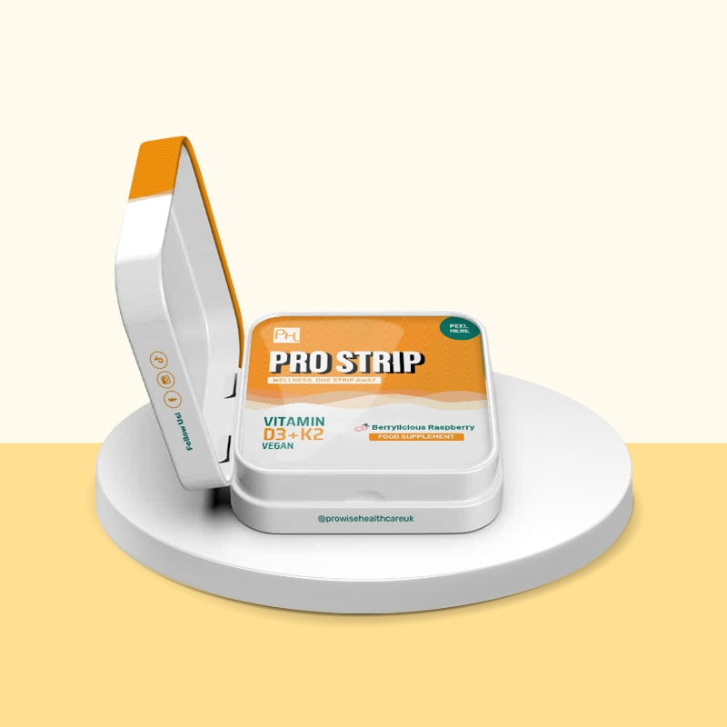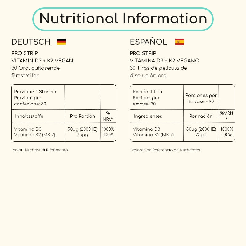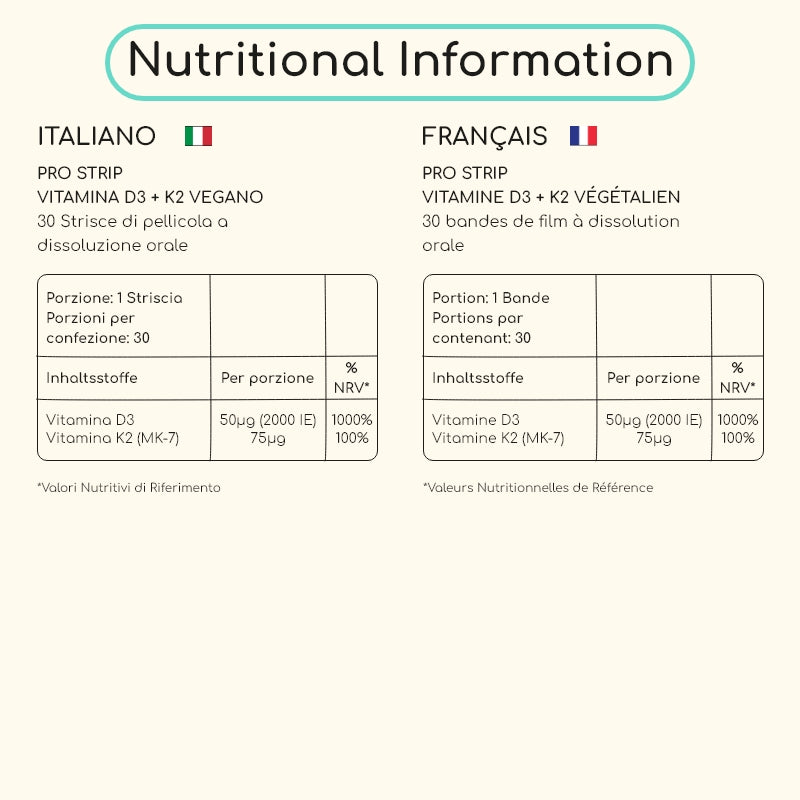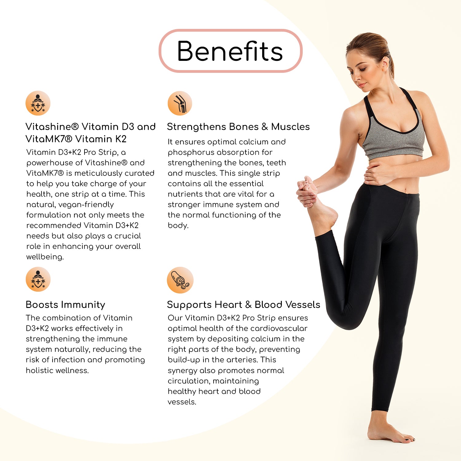 Vitamin D3+K2 Pro Strip, a powerhouse of Vitashine® and VitaMK7® is meticulously curated to help you take charge of your health, one strip at a time. This natural, vegan-friendly formulation not only meets the recommended Vitamin D3+K2 needs but also plays a crucial role in enhancing your overall wellbeing.