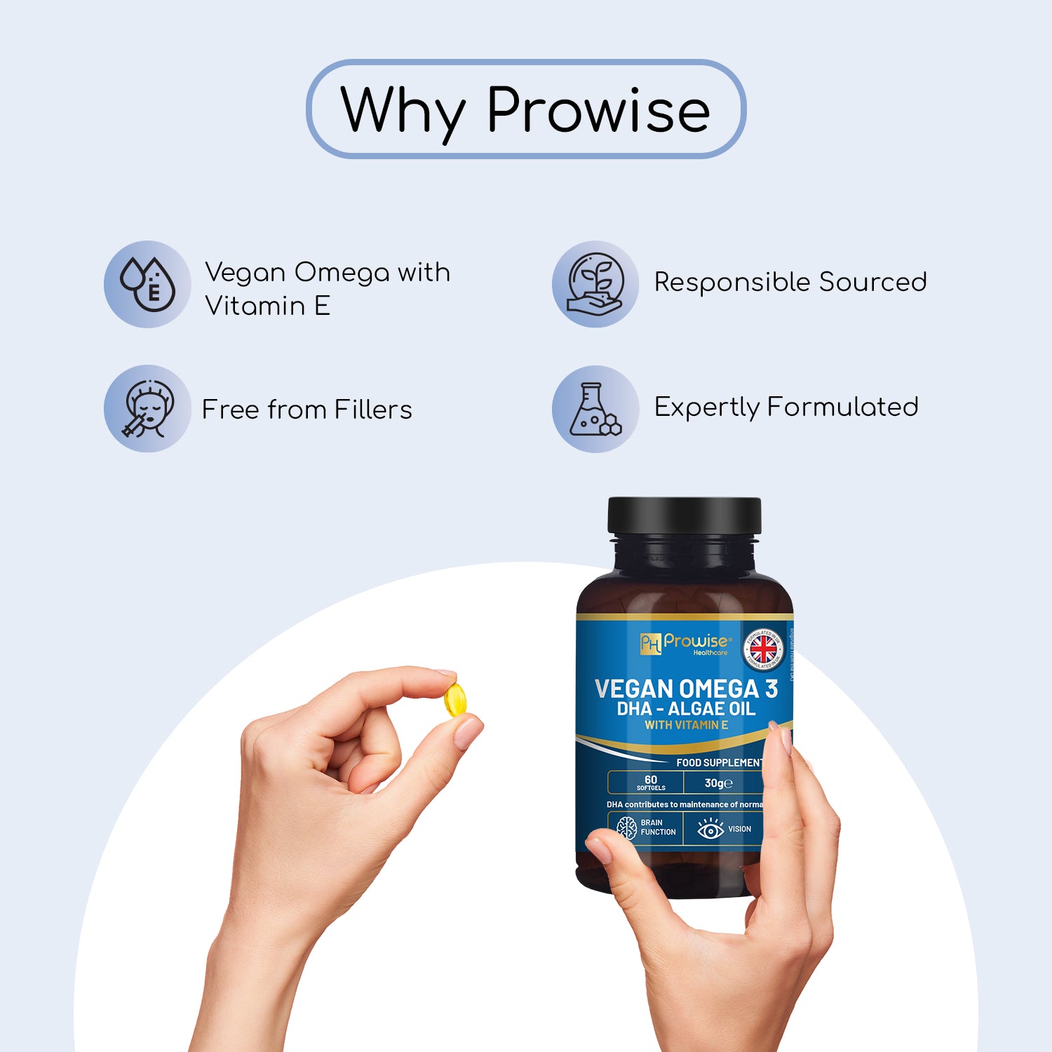 Prowise's vegan omega-3 supplement is enriched with Vitamin E to promote the absorption of DHA, maximising its potential for better brain and vision health.
