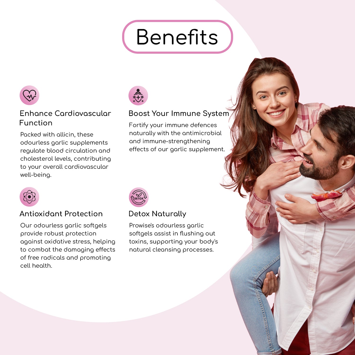 Unleash the power of nature's ancient remedy with our high-potency garlic oil supplement without a trace of its pungent aroma. Rich in allicin, our garlic oil supplement helps your body combat oxidative stress, improves your cardiovascular health and strengthens your body's natural defence mechanisms.