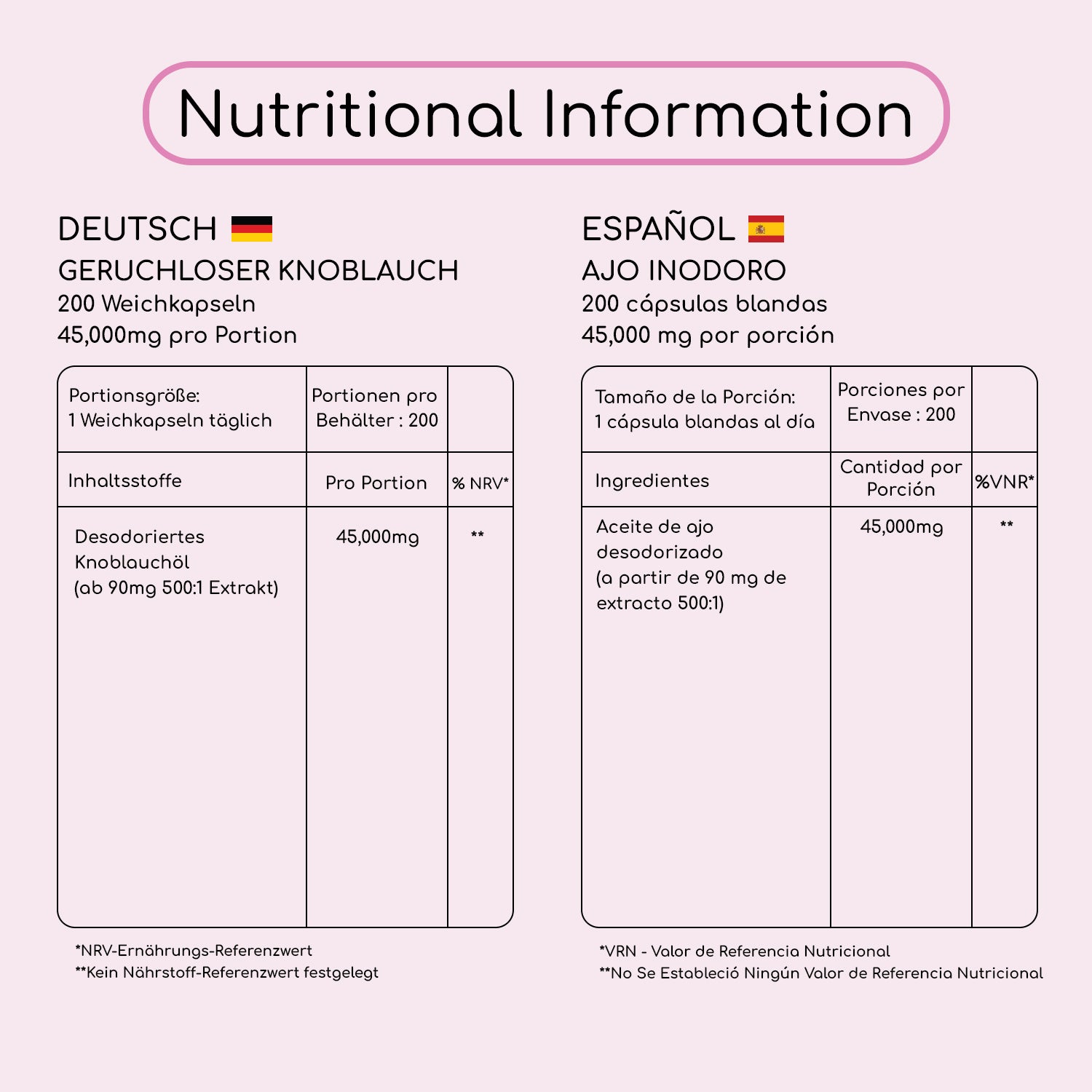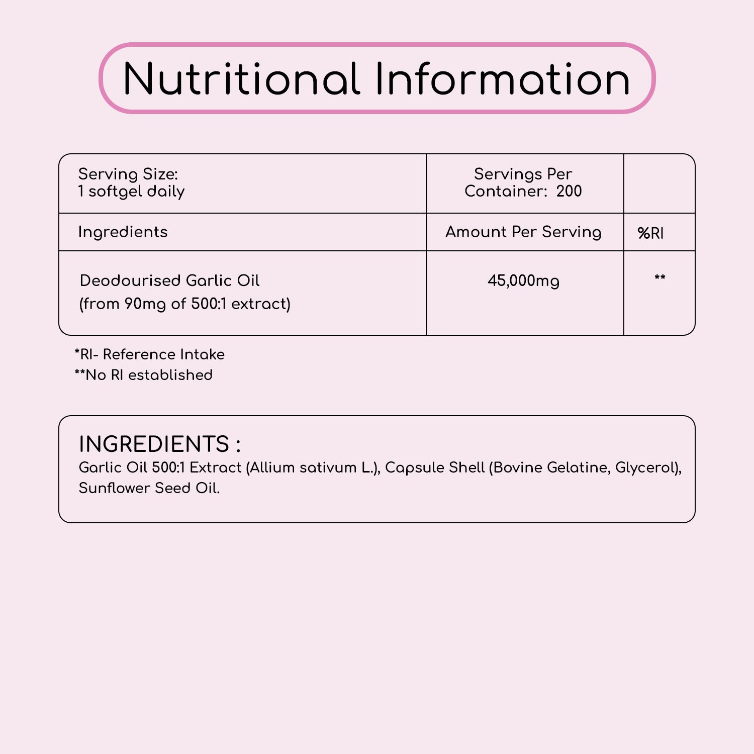 Each softgel is made from cold-pressed garlic oil to preserve its nutrients and does not contain any GMOs, fillers, preservatives or additives. With 200 odourless garlic capsules in every bottle, you get better health and value for money.