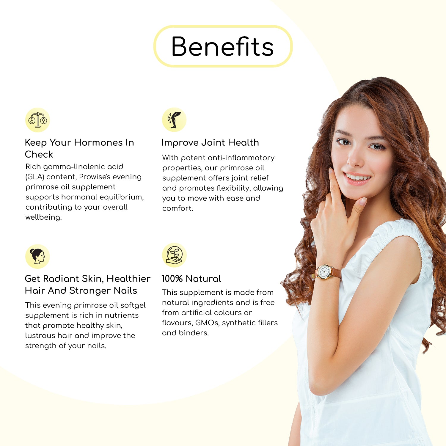 Rich gamma-linolenic acid (GLA) content, Prowise's evening primrose oil supplement supports hormonal equilibrium, contributing to your overall wellbeing.