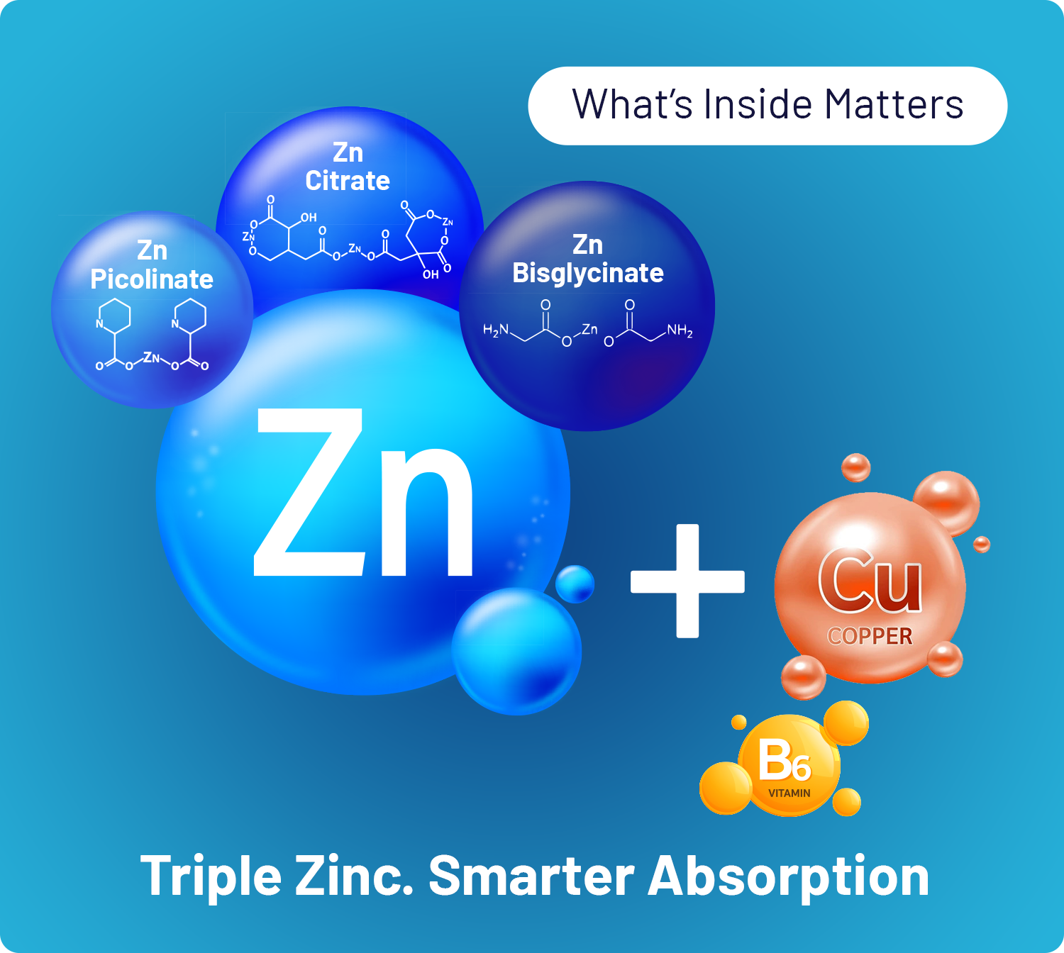 Our Zinc Picolinate Complex is expertly formulated using highly absorbable forms of zinc to support immunity, skin health, and metabolic function. By combining Zinc picolinate, citrate, and Bisglycinate, our zinc supplement provides elemental zinc in forms your body can efficiently absorb and use.